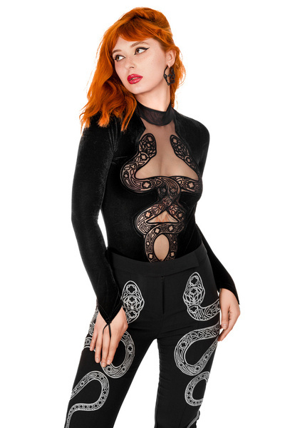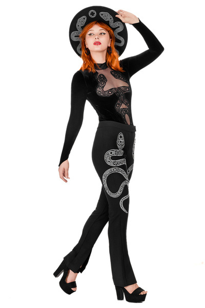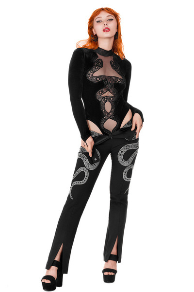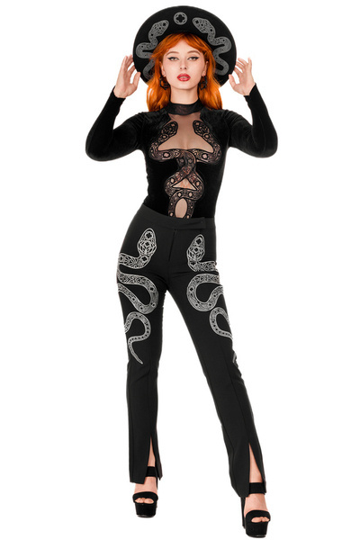 Bold pants adorned with intricate embroidery depicting a snake filled with delicate cathedral motifs. They are designed for daring women who wish to express their fierce nature through fashion. The symbolism of the snake, often associated with wisdom, mystery, and transformation, adds depth and significance to the pants, emphasizing both their unique design and the strength of the women who wear them.