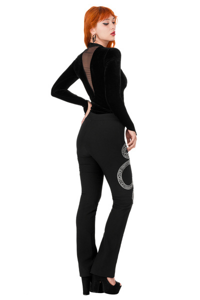 These gothic-inspired pants in a slim fit wonderfully complement the silhouette and visually elongate the legs. The characteristic flared shape of the pant legs is finished with slits, adding movement and dynamism to the entire ensemble. These subtle cutouts draw attention and lend the pants a touch of sophistication.