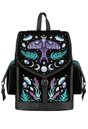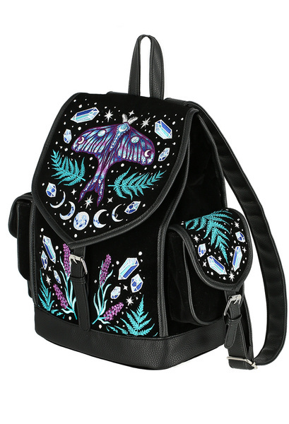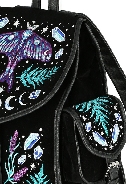 • Gothic school backpack with moon phases, lavender flowers, moth and crystals. Made from velvet and has two large side pockets. Height: 37 cm, Width: 25 cm, Bottom width: 14 cm