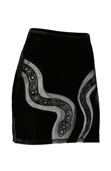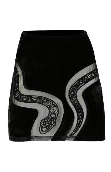 Crafted from a distinctive blend of velvet and mesh, the snake skirt boasts a unique combination of textures. The original, Restyle-designed pattern, inspired by the intricate beauty of Gothic architecture, has been meticulously laser-cut and seamlessly sewn onto the mesh fabric.