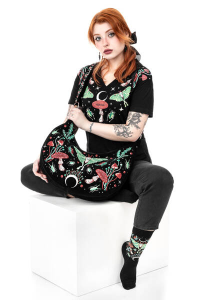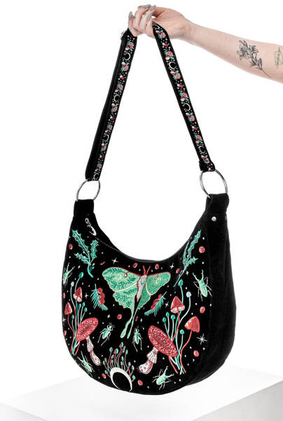 ⋆ Stunning intricate embroidery featuring Luna Moth, toadstools, magic mushrooms, beetles, forest plants, and twinkling stars on body and strap