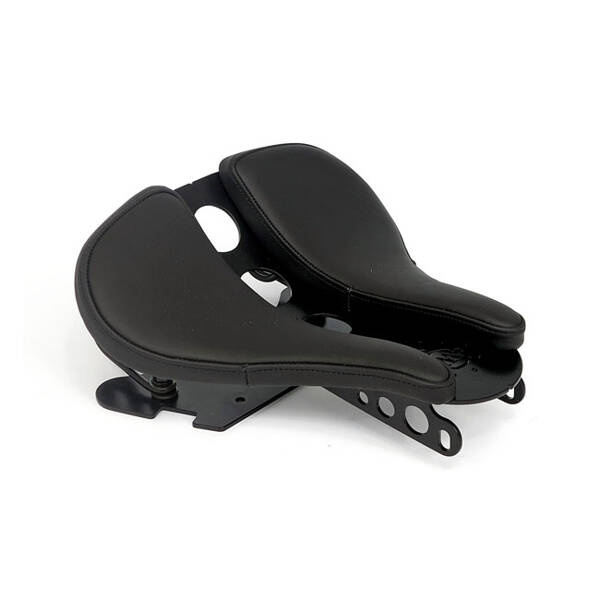 With one-piece seat. Gloss black powder coated steel construction. Includes the frame mount plate, early scissor style seat springs and a seat with a 2-piece genuine leather upholstery. The steam-punk orientated styling gives it the right retro touch and is guaranteed to lift your bike to new custom levels. Note: Great style-combo with the Cult-Werk swingarm mounted fenders. Note: For the optional Cult-Werk ABS frame cover see 963105 (short) or 963104 (long, up to the shocks).