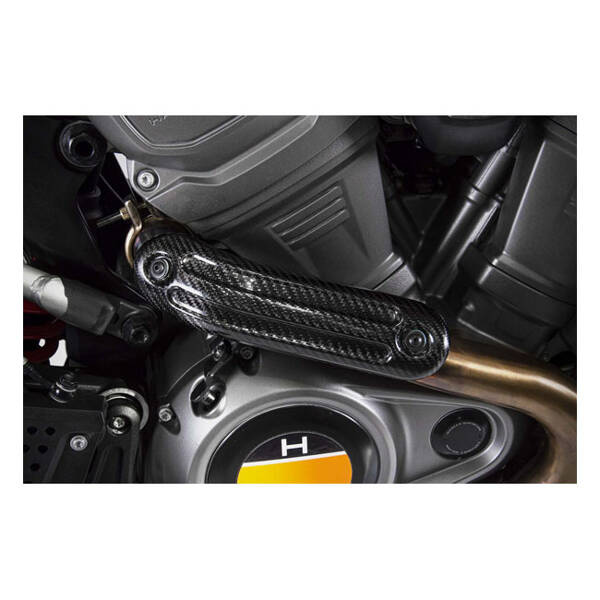 Carbon material. Protective heat shield for the rear exhaust header / head pipe. Compatible with the OEM Pan America head pipes. Complete with mounting hardware for Pan America models with OEM head pipes. Note: Heat shield will also fit Zard's 973642 stainless head pipe set as a direct replacement item.