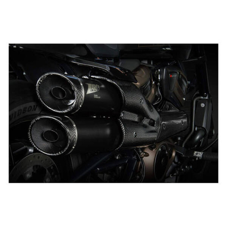 Euro 5 homologated. With oval mufflers and sleek, diagonally cut carbon fiber end caps. Comes a 1000°C resistant matte black Cerakote ceramic coating. Made from AISI 304 stainless steel. OEM weight 9.0kg. Zard weight 5.1kg. making it a lightweight 2-1-2 system. The exclusive two-piece carbon fiber heat shield replaces the original plastic part, for a perfect Sportster S design integration. Manufactured using high end 2D/3D lasers, robots, bending machines and skilled qualified welders for the perfect result. Note: This is a EU homologated exhaust system. Removing or modifying the Db killer on homologated exhausts will void the warranty and the homologation. Certification is valid for unmodified stock bikes, for the specific models and model years as mentioned in the product descriptions (Directive 97/24/CE, EU regulation 134/2014). The approval number, shown on the supplied relevant certificate, is stamped on every exhaust system and it must be presented to law enforcement when checked.