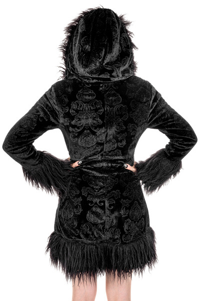 The shaggy fur and intricate gothic patterns give it a baroque-inspired touch and a dark, romantic charm.
