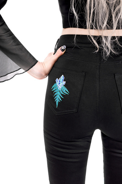 Embroidered bell-bottom trousers seem straight out of a magical fairytale. Luminous moths shimmer like the aurora borealis against a deep black backdrop. Fern leaves, lush and vibrant, feel almost alive, as if plucked from a mystical forest. Crystals, sparkling like true gems, add a mystical touch. Silver moons light up the design like a night sky.