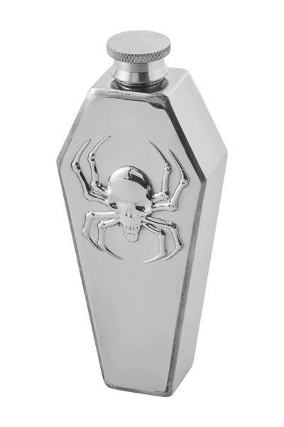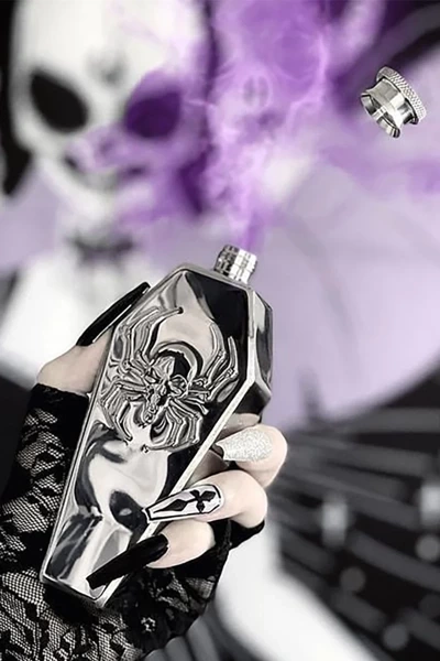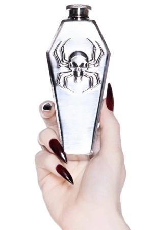 Pour yer fav cold drinks to take on-the-go in fun statement hip flask. Design in a coffin shape, statement spider detail and screw lid