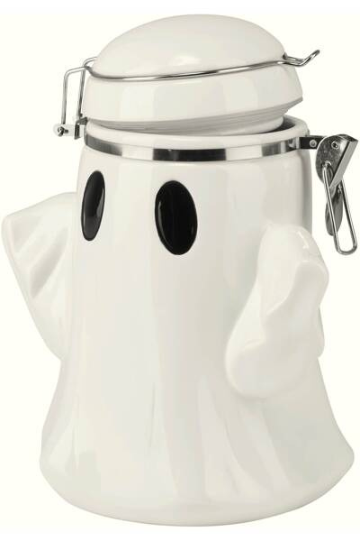 White ceramic jar by Killstar in the shape of a cute ghost. The head serves as an opening and can be closed again with an airtight closure.