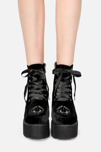 With a walkable chunky heel and rich, tonal design, these gothic velour ankle boots are perfect for everyday adventures with an enchanted edge.