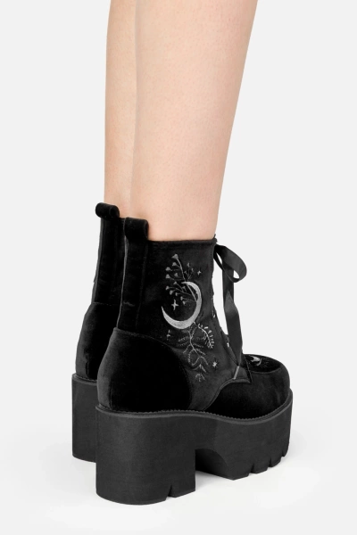 Ever wandered through a midnight forest, guided only by moonlight and instinct? The Moonlit Trail Boots are made for those moments — quiet, magical, and wild. Crafted from soft velour faux suede, these black embroidered platform boots feature subtle grey threadwork of ferns, crescent moons, and stars — like a secret stitched in shadow.