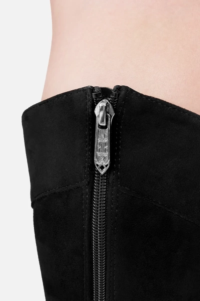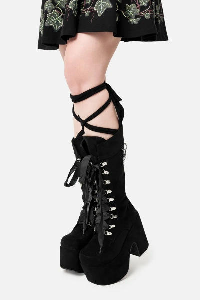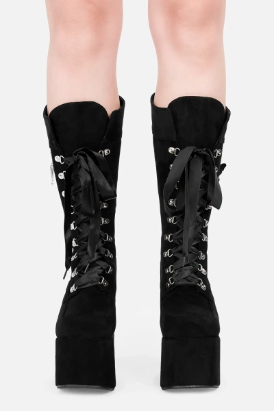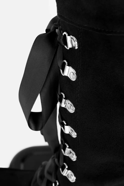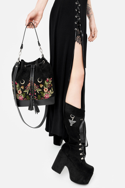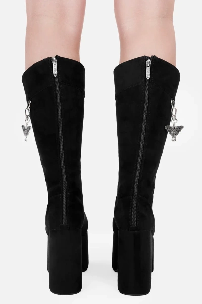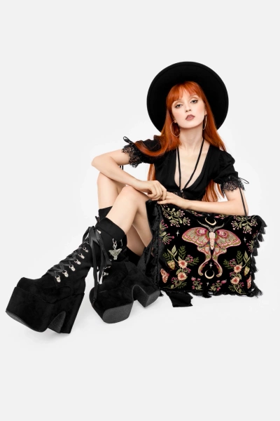 Do you walk the world when others sleep? The Night Wanderer Platforms are made for twilight souls — those drawn to the moon, the quiet streets, and the magic of midnight. These dramatic black faux suede platform boots blend bold height with delicate, gothic details. With silver hardware, satin ribbon laces, and removable moth charms, they’re equal parts powerful and poetic.