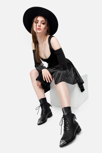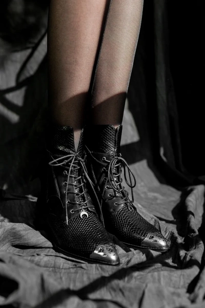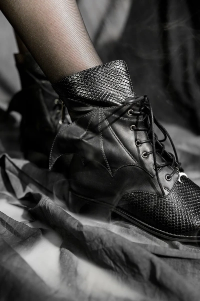 The Shadow Wing Pikes are bold, sculptural, and unapologetically goth. Made from contrasting snakeskin-effect and smooth PU leather, these low heel gothic pikes feature dramatic 3D bat wings that curve from the ankle. A custom cathedral-style metal toe cap adds sharp elegance, finished in antique silver.