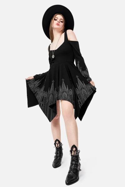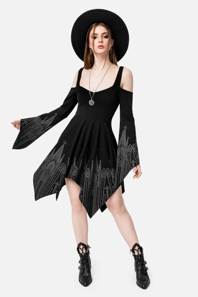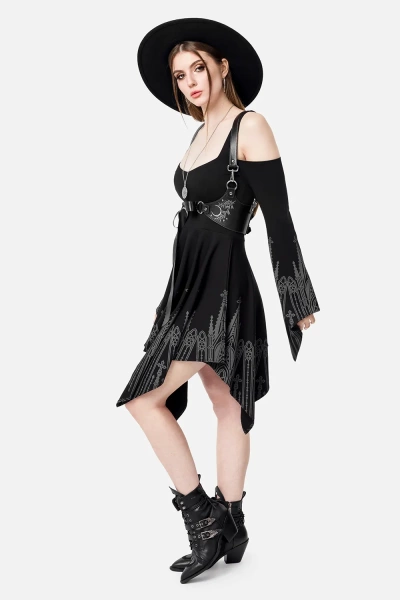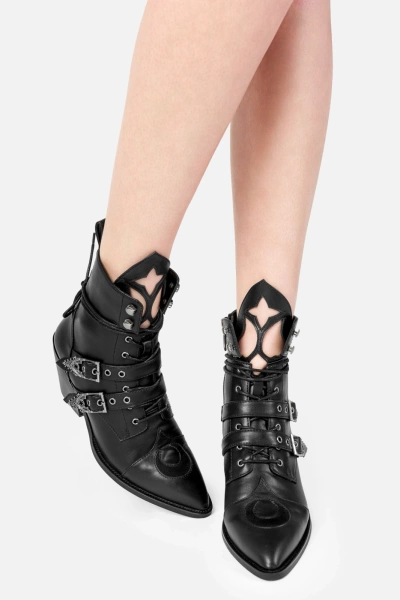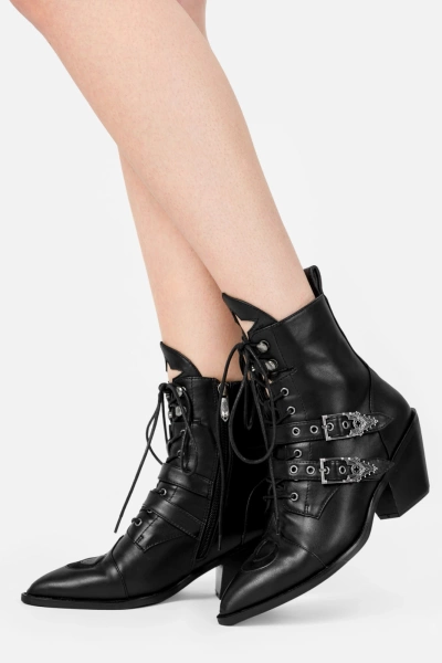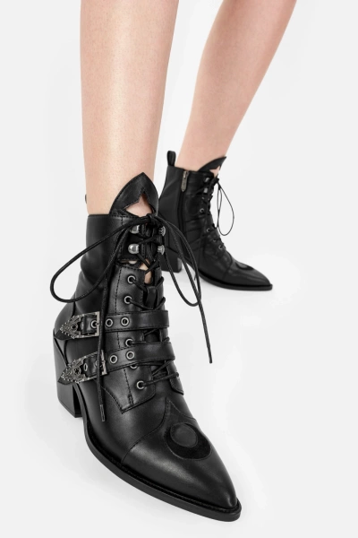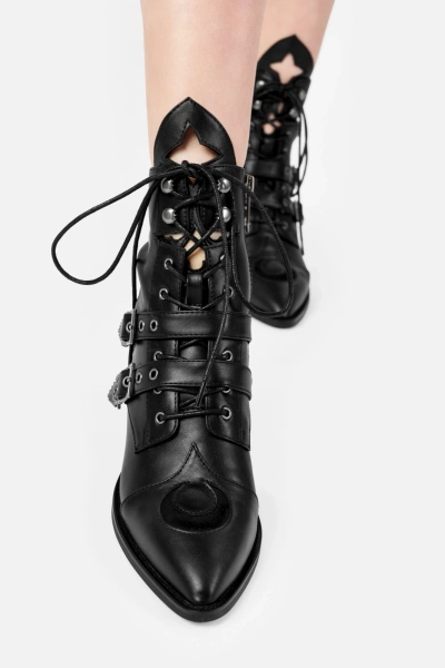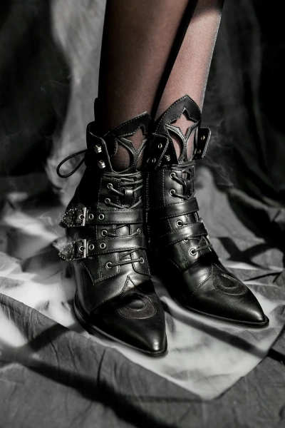 The Moonstruck Boots are gothic ankle boots with architectural detail and celestial flair. Made from sleek PU leather, they feature cathedral tracery cut-outs, crescent moon toes, and spire-style buckle straps. Built to be styled your way, they offer two distinct looks — lace them up fully for a classic silhouette, or wrap the laces at the ankle to reveal the pointed tongue and detailed cut-outs.