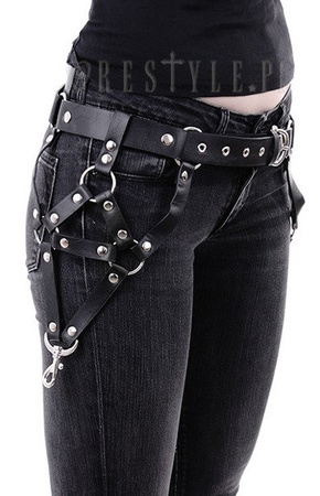 Belt made of black faux-leather. It's made of straps linked together in the shape of triangles. It has many rivets, O-rings and carabiners. Great accesory for any gothic or alternative outfit. One size fits all: Circumference: 87-107 cm