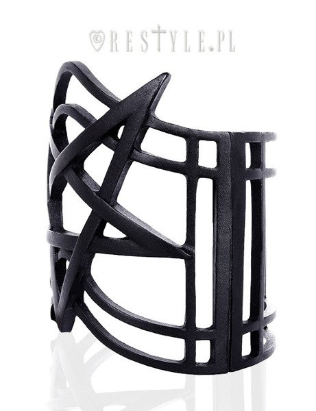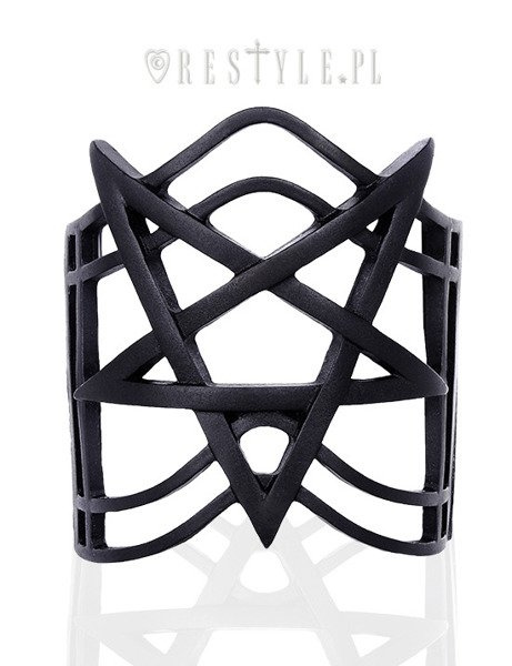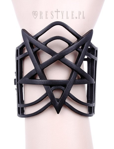 Bracelet presents pentagram placed on modern, geometric background.