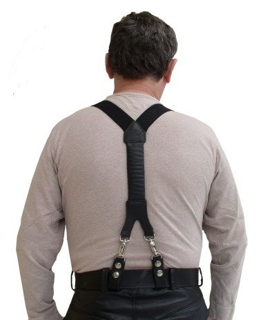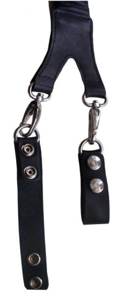 Trouser suspenders. Made partly of leather, partly made of rubber. To be mounted on the belt next to trousers on special loops fastened with press studs. Adjustable length.