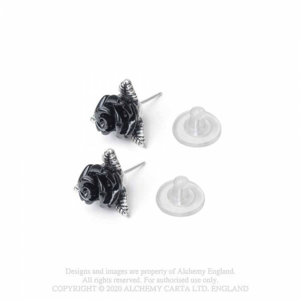 A pair of pewter foliage ear-studs with a black rose at the centre.