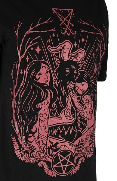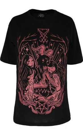 The print shows goat, the symbol of the devil. It is accompanied by two naked women, one of them tenderly cuttle. All are surrounded by branches, plants, and stars. Over their heads, there is the Lucifer Sigil.