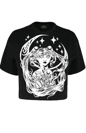 The print shows a dark sorceress. Sailor Moon's body is entangled by her long blond hair. Roses and crescent tattoos made her look more mysterious. Behind in background, there is the crescent moon and sparkling stars.