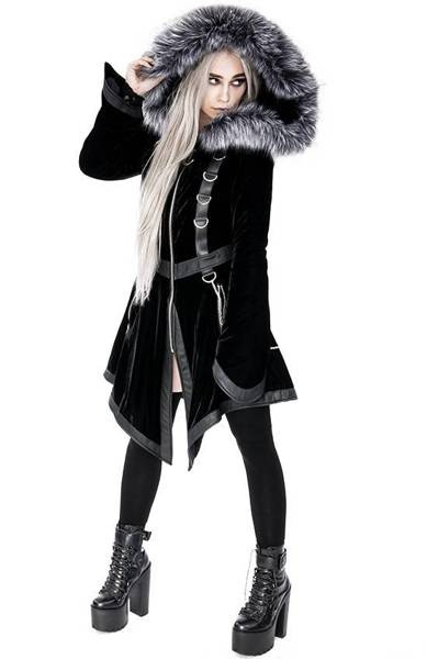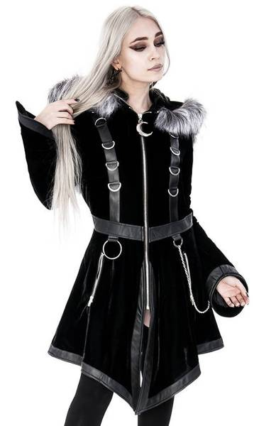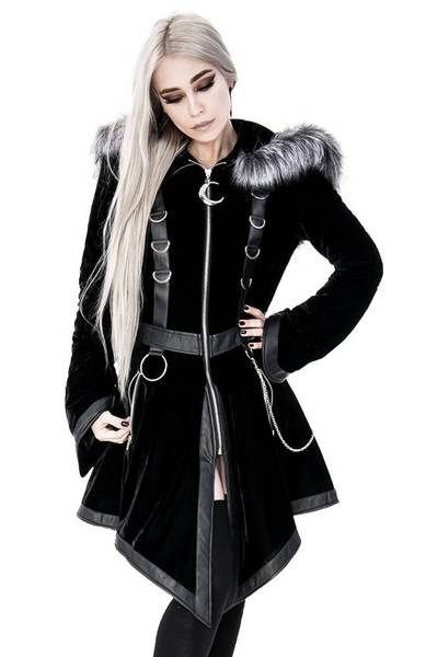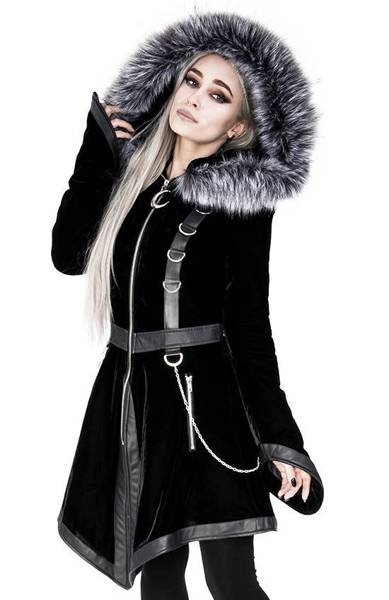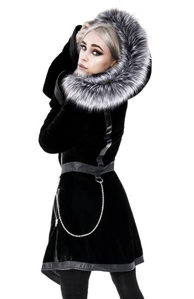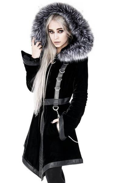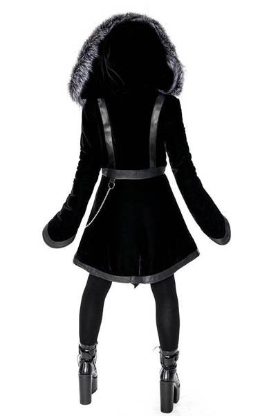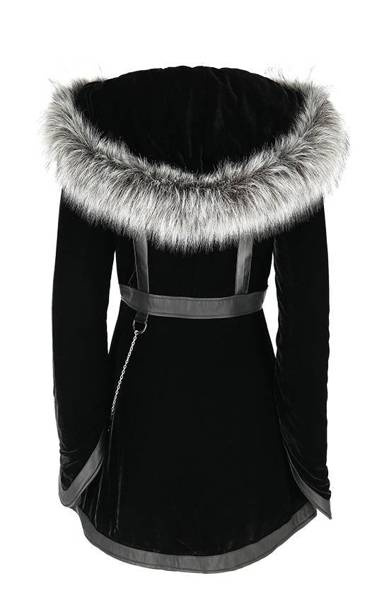 There’s nothing worse than freezing in winter! We're sure you think so too. That’s why we have a warm, stylish gothic coat that you’ve always dreamed of. Made of soft, black velvet, and thermally insulated (padded). The waisted shape of the coat emphasizes the silhouette and adds a feminine charm. The large and warm hood is ideal for windy days. It’s trimmed with long pile faux fur, wolf gray in colour. The hood is fast and easy to detach because it has a zipper.