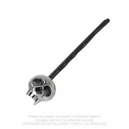 A small pewter, punky skull on the end of a standard black hair grip. One supplied.