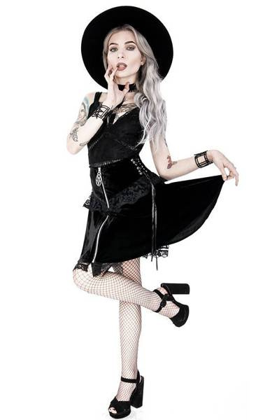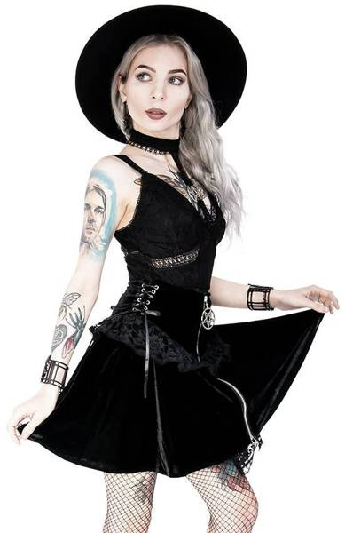 Gothic mini skirt made of soft velvet and lace inserts. Lace elements emphasize the hips. A lace lining that extends beyond the hem adds sex appeal. The skirt is fastened with a meter-long zipper with a pentagram pull. The decorative and functional elements are corset ties on the sides - they are ultra-feminine. Thanks to them, you can adjust the skirt to your circumference.