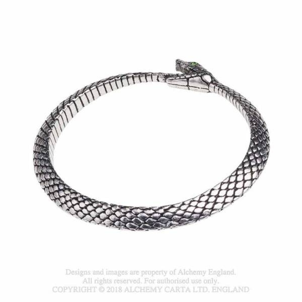 A detailed cast pewter, solid serpent bangle, (no adjustment), with small green Swarovski crystals set into its eyes..