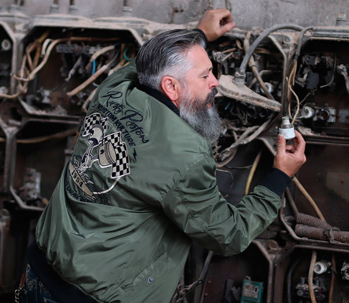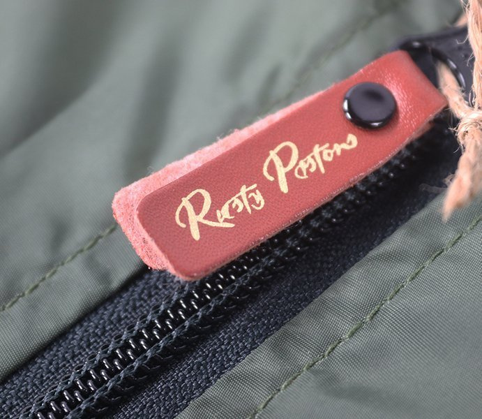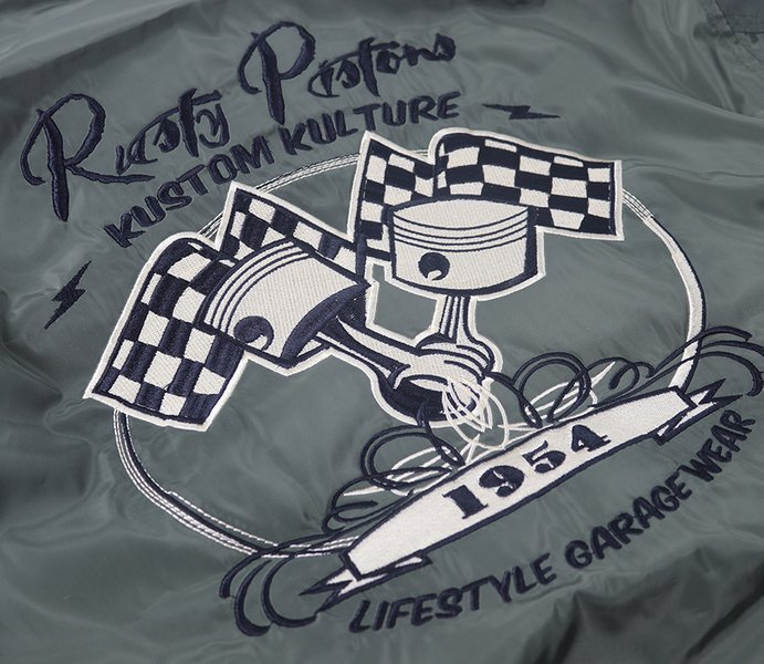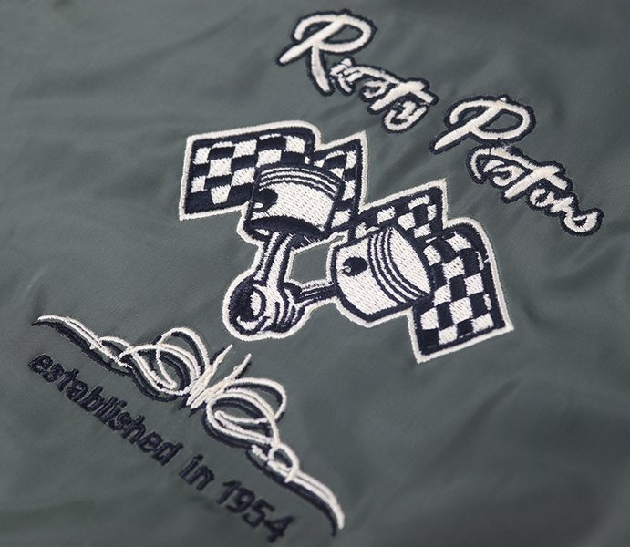 - large embroidery on the back in the style of a custom Rusty Pistons