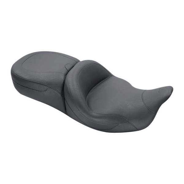 Black. Front width 19", rear width 14". Standard stitch. One-piece 2-up seat with an extremely comfortable and wide rider's bucket, with an 1.75" further backwards seating position (compared to a stock Electra Glide position), and a likewise generous passenger seating area. This one is the ultimate Mustang for some serious PowerTouring and could very well be your choice when entering the Iron Butt. Seats will fit with a handrail. Note 1: Not compatibe with H-D or regular Mustang backrest kits. They can, however, be equipped with the separetely available Mustang backrest 537512 (Smooth) or 537513 (Regal) backrest pad & post, which will fit the built-in receiver.