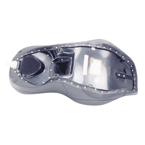 Black. Front width 17", rear width 14". Standard stitch. This Standard Touring design offers excellent touring comfort. It is a split foam construction, mounted on a one-piece marine-grade fiberglass baseplate. The seat nose is narrower than stock for easier feet placement on the ground. Note: The one-piece baseplate is open in the middle and will accept a rider backrest kit, which is separately available. Note: Will not fit Road King models with a FLHT handrail.