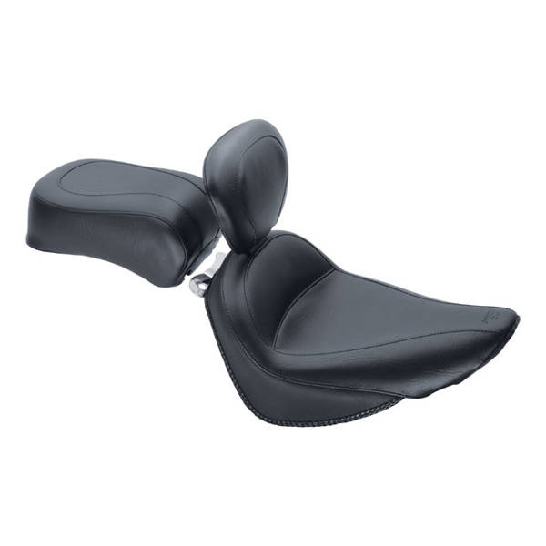 Plain black. 8" wide. With recess. Compatible with a rider backrest. Note 1: Mustang solo seats & passenger seats cannot be mixed with OEM solo or passenger seats. Note 2: Solo seats with a rider backrest require a recessed passenger seat, the recessed section provides the necessary space for the rider backrest.
