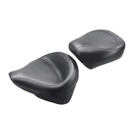 Black, plain. 17.5" wide. With rider backrest. Note 1: Mustang solo seats & passenger seats cannot be mixed with OEM solo or passenger seats.