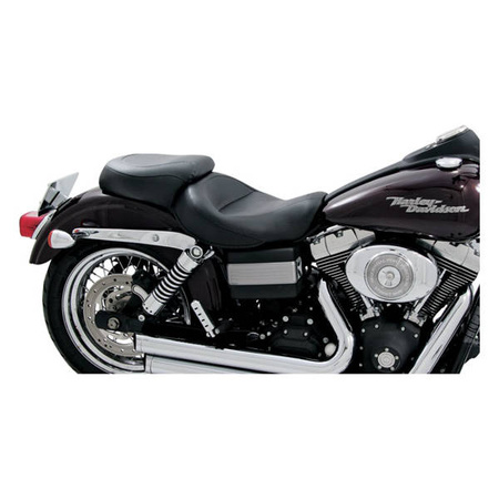Black. Front width 15", rear width 12". Standard stitch. Extra wide for additional comfort. Places the rider in the stock rider position with additional lower back support. Perfect for long distance 2-up cruising. The seat is a split foam construction, but mounted on a one-piece marine-grade fiberglass baseplate.