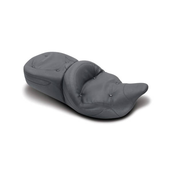 Black. Front width 19", rear width 14". A classic pillow seat upholstery, hand-tied buttons and extra padding for the true upholstered pillow top look. One-piece 2-up seat with an extremely comfortable and wide rider's bucket, with an 1.75" further backwards seating position (compared to the stock Electra Glide position), and a likewise generous passenger seating area. This one is the ultimate Mustang for some serious PowerTouring and could very well be your choice when entering the Iron Butt. Seats will fit with a handrail. Note 1: Not compatibe with H-D or regular Mustang backrest kits. They can, however, be equipped with the separetely available Mustang backrest 537512 (Smooth) or 537513 (Regal) backrest pad & post, which will fit the built-in receiver.