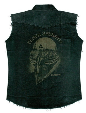 Cechy kamizelki: - kolor CZARNY, - wykonana jest ze 100% wysokogatunkowej bawełny. Bawełna jest gruba, mięsita, wysokiej jakości i odporna na niszczenie, w strukturze przypomina jeans, - kołnierz, - efektowne, postrzępione wykończenia na rękawach i u dołu, - zapinana jest z porzodu na czarne, metalowe zatrzaski, - z tyłu duży wysokogoatunkowy nadruk – tzw. „ekran”, - z przodu na lewej piersi, wyszywane logo BLACK SABBATH, - z przodu na prawej piersi kieszeń zapinana na czarny, metalowy zatrzask. Wszystkie produkty, w tym nadruki, hafty i naszycia są dziełem RAZAMATAZ (tylko brytyjsko-europejskie rączki biorą udział w produkcji).Rozmiar | Szerokość w klatce / cm | Długość / cm |