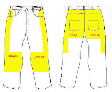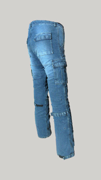 Spodnie motocyklowe wykonane są z wysokogatunkowego jeansu o gramaturze 12oz. Stylizowane przez dekatyzowanie i przetarcia. W standardzie posiadają wzmocnienia na biodrach, tyłku i kolanach ze 100% KEVLARU.