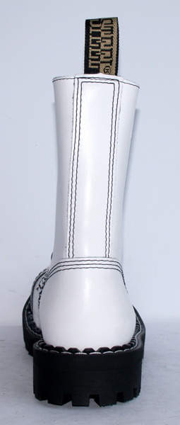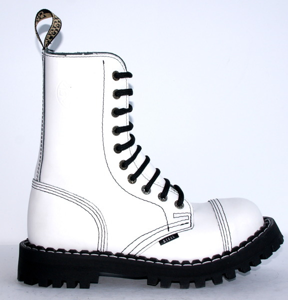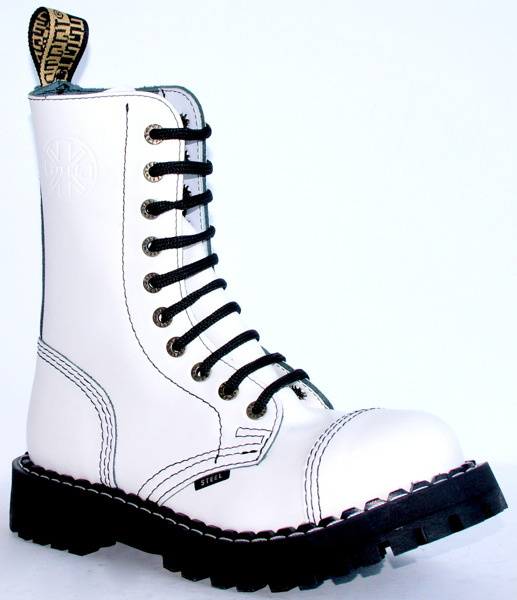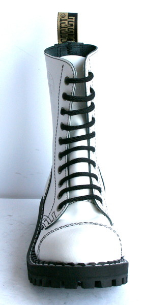 • Średnie, 10-dziurkowe BIAŁE glany ze skóry naturalnej bydlęcej licowanej. Produkcja polska. Najwyższa jakość wykonania i materiałów. Potrójne szwy, śrubowana podeszwa LUG, stalowe wzmocnienia w czubkach butów. Gwarancja długiego i wygodnego używania.