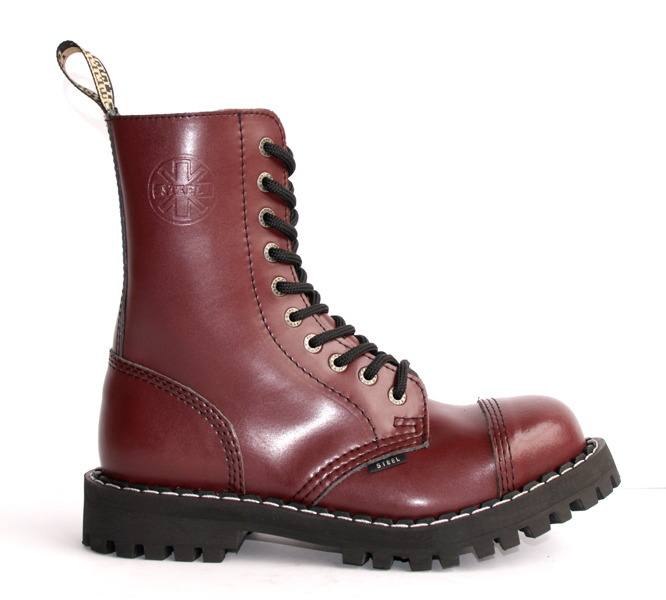 • Średnie, 10-dziurkowe BURGUND glany ze skóry naturalnej bydlęcej licowanej. Produkcja polska. Najwyższa jakość wykonania i materiałów. Potrójne szwy, śrubowana podeszwa LUG, stalowe wzmocnienia w czubkach butów. Gwarancja długiego i wygodnego używania.