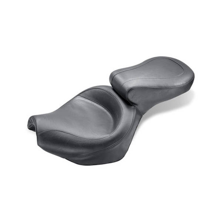 A plain touring seat with 14" wide rider area and 10,5" wide passenger area. The Standard Touring platform features several design improvements over the stock seat. A deeply pocketed driver bucket sits you in the ideal cruising angle at a similar reach to the controls compared to stock. The driver's back is well supported by the nose of the passenger seat that extends forward to create a full high backrest.
