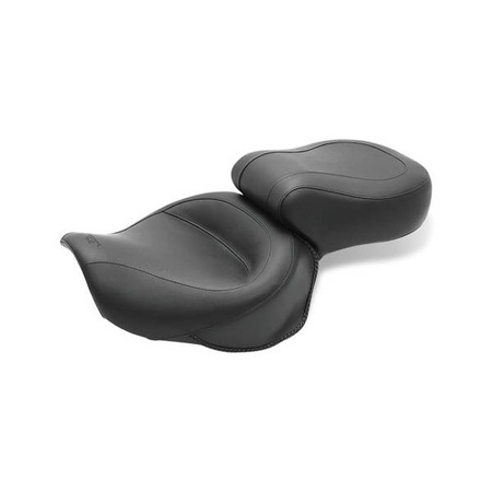 A plain touring seat with 15" wide front seat and 12" wide passenger seat. The Standard Touring platform features several design improvements over the stock seat. A deeply pocketed driver bucket sits you in the ideal cruising angle at a similar reach to the controls compared to stock. The driver's back is well supported by the nose of the passenger seat that extends forward to create a full high backrest.