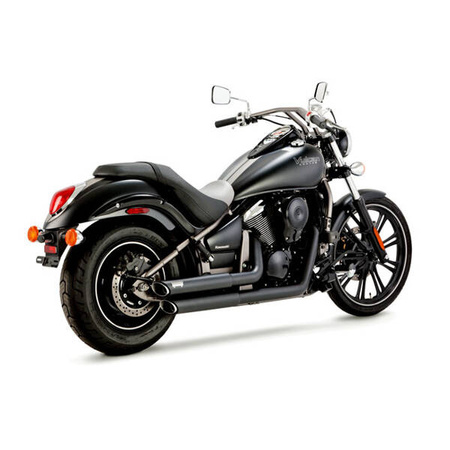 Designed specifically for the middleweight metric cruiser segment, the Twin Slash Staggered combines a host of features in a great looking exhaust system. The Twin Slash Staggered comes encased with full-length heat shields over the head pipes and mufflers to conceal heat discoloration. Sporting the signature Vance & Hines twin slash end treatment, the versatile oversized mufflers of Twin Slash Staggered can be refitted with two different optional baffle cores. Mounting hardware and easy-to-understand instructions are included. Quiet baffle: 981791.
