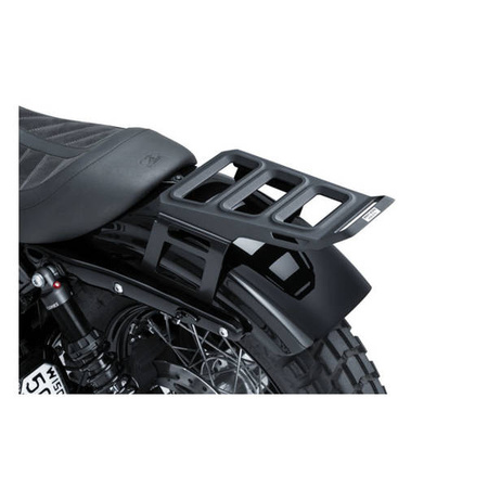 Satin black. Pressed steel, resembling a no-nonsense military style. Complete with hardware and brackets, that install between fender struts and fender for a clean look, for a simple bolt-on installation. The tilted rear section and the ribbed design provides additional strength as well as an anti-slip surface to help prevent the typical sideway-slide of your luggage when things are a bit out of balance. Note: Max. load 10lbs (4.5kg).