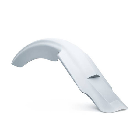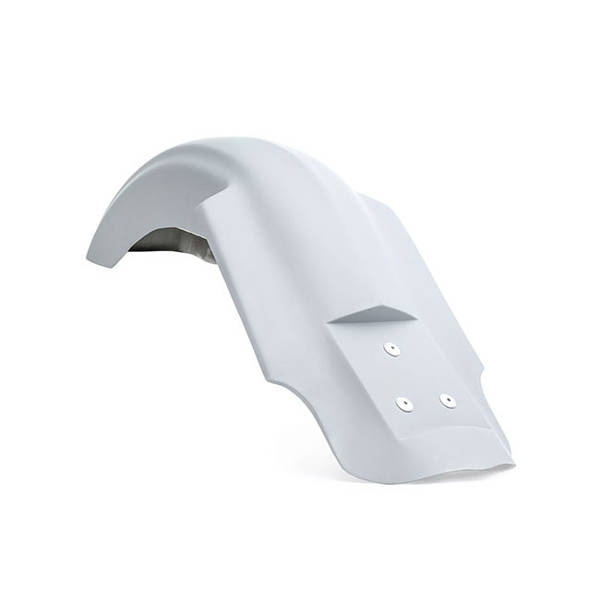 Designed for 180x200mm German sized license plates. Hand-laid unpainted gel coated stiff, strong, straight & light fiberglass rear extended fender that screams custom. With pre-installed license plate mounting hardware for integrated license plate or license plate holder. Dual cut for 2-2 exhaust systems. Note: Requires drilling and fitment checks before painting and final assembly.