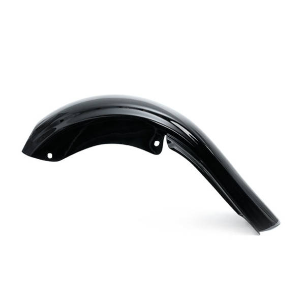 Hand-laid black unpainted gel coated stiff, strong, straight & light fiberglass rear extended fender that screams custom. Without license plate holder cut-out allowing a custom license plate installation. Dual cut for 2-2 exhaust system. Note: Requires drilling and fitment checks before painting and final assembly.