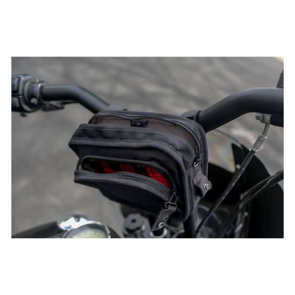 Burly calls this their 'Voyager Handlebar Bag' and nicknamed it Dime Bag. Stuff it with dimes, bank notes or something else, its true middle name stays multi-functionality. Great for use on club style bikes equipped with T-bars or high style risers but that don't mean its use is limited to handlebars since it mounts virtually everywhere. Comes with two exterior zippers with a large interior space and elastic pockets the feature YKK zippers secured with an anti-flail snap system. Mounts with 4 Velcro straps and MOLLE system. Approx dimensions: 25.5" (64.8 cm) high x 9" (22.9 cm) wide x 9" (22.9 cm) deep
