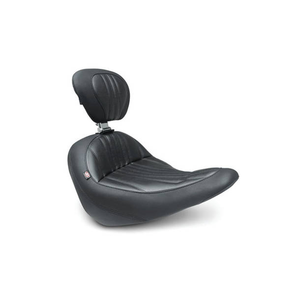 Black. 15" wide. Dagger stitch design. With adjustable rider backrest. The backrest is easily removed when not required. Note 1: Mustang solo seats & passenger seats cannot be mixed with OEM solo or passenger seats. Note 2: Solo seats with a rider backrest require a recessed passenger seat, the recessed section provides the necessary space for the rider backrest. Note 3: See 578019 for a 11" wide matching passenger seat.