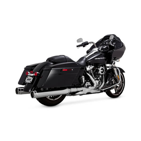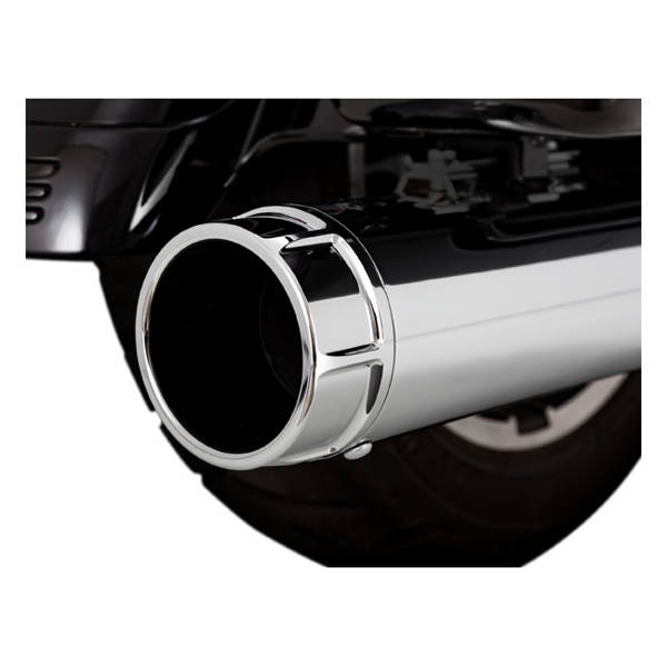 Chrome with chrome end caps. Vance & Hines knows as no other how to build an exhaust that will comply with all necessities required to provide excellence. In a quality exhaust system, like the Torquer 450's, you'll find a combination of looks, styling, quality, sound and performance gains all merged into one. Ultimately build for performance, hence the large 4.5" diameter body since performance requires flow and the combination of high flow and acceptable muffling is created by a large volume muffler. The sound is a bold, low and intimidating rumble that will impress through a new patent-pending design baffle. Finished with a rivited Vance & Hines logo badge and CNC machined billet end caps for perfection to the very end. Note: See 929936 for the optional -2-3 dB Quiet Baffle kit that also offers a deeper rumble.