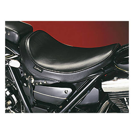 12.5" wide. Foam. A low profile seat with a smooth upholstery and a classic skirt design detail, perfectly matching a classic styled bike. Hand-built with precision contoured marathon foam and, like all LePera seats, on a 16 gauge black powder coated steel base plate. Note: An matching Sanora passenger seat is optionally available.