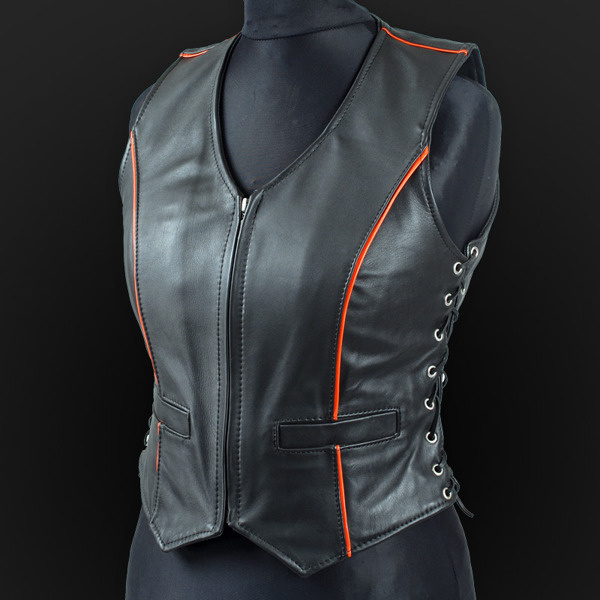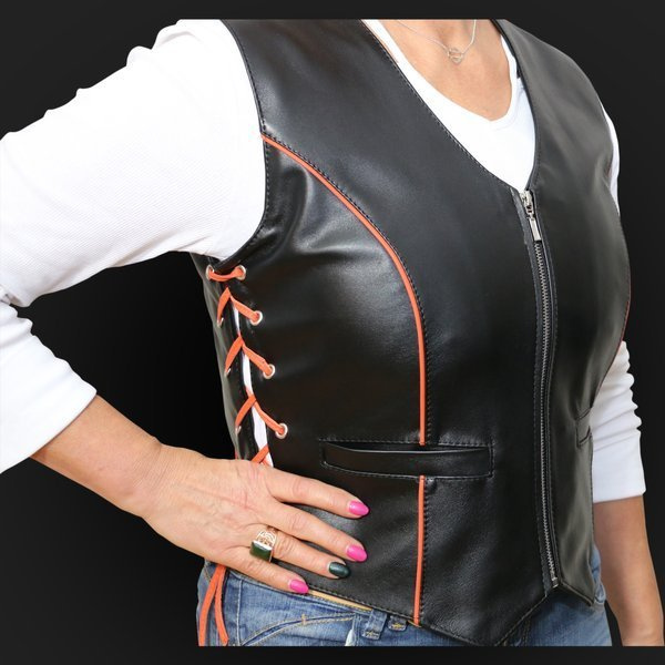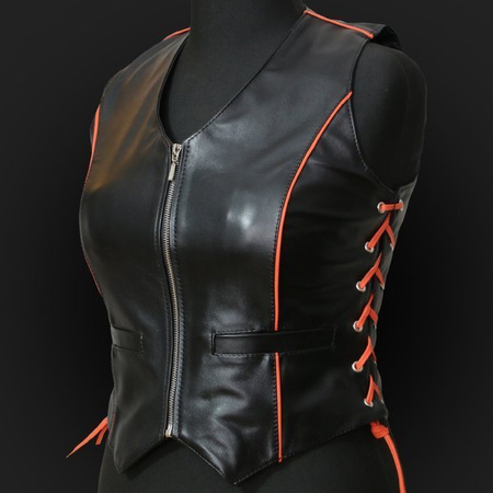 • Kobieca kamizelka motocyklowa z wysokogatunkowej miękkiej skóry bydlęcej - 0,8 mm. Zapinana jest na suwak. Z przodu posiada kieszonki. Pięknie wykończona lamówkami z kolorowej skóry. Do noszenia na kurtkę, na koszulkę lub bezpośrednio na ciało.