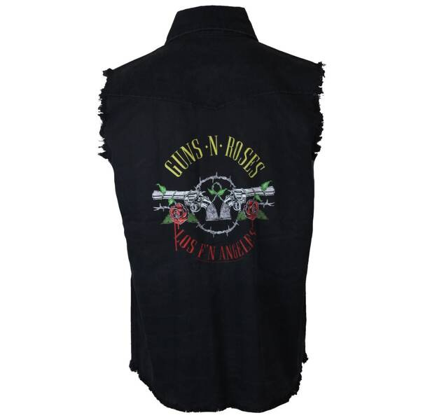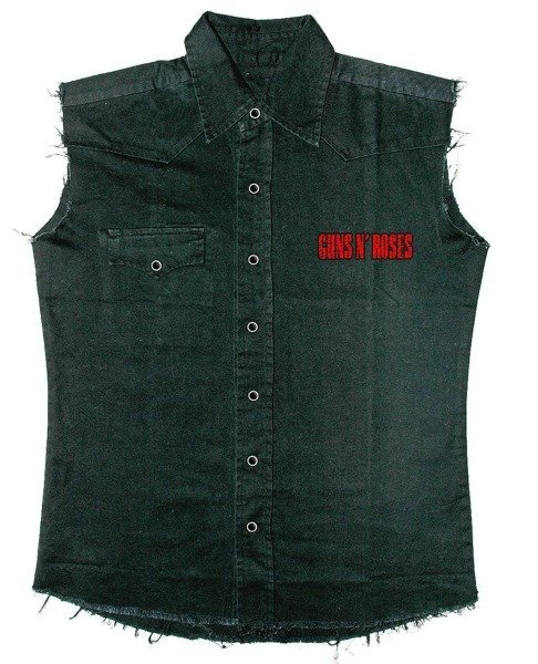 Cechy kamizelki: - kolor CZARNY, - wykonana jest ze 100% wysokogatunkowej bawełny. Bawełna jest gruba, mięsita, wysokiej jakości i odporna na niszczenie, w strukturze przypomina jeans, - kołnierz, - efektowne, postrzępione wykończenia na rękawach i u dołu, - zapinana jest z porzodu na czarne, metalowe zatrzaski, - z tyłu duży wysokogoatunkowy nadruk – tzw. „ekran”, - z przodu na lewej piersi, wyszywane logo GUN N ROSES, - z przodu na prawej piersi kieszeń zapinana na czarny, metalowy zatrzask. Wszystkie produkty, w tym nadruki, hafty i naszycia są dziełem RAZAMATAZ (tylko brytyjsko-europejskie rączki biorą udział w produkcji).Rozmiar | Szerokość w klatce / cm | Długość / cm |